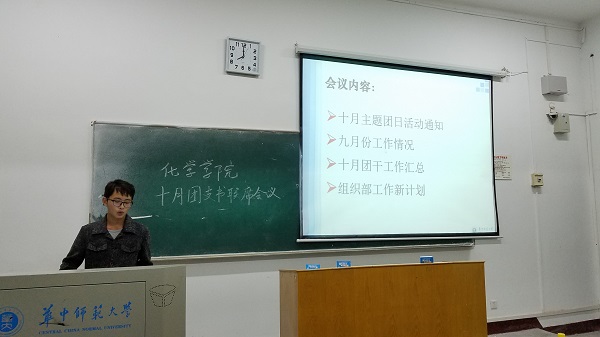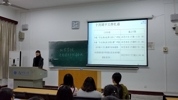 在此之后,组织部长刘诗雨为2015级和2016级的各班团支书详细传达了十月团干工作的安排,并且向与会人员展示了组织部的工作新计划,计划旨在加强与各年级、各支部的沟通,并通过互提建议、意见汇总反馈等方式实施计划。她表示,希望通过新计划的实行可以促进各团支部更好地开展团日工作。