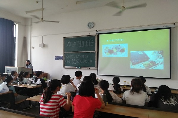 在班主任精彩的讲话结束后,教室里响起了《明月几时有》的宛转悠扬的歌曲声,同学们一边欣赏音乐一边分享中秋月饼和各类零食,歌曲结束后团支书陈素捷通过PPT向同学们介绍特色的地方中秋活动,欣赏中秋花灯图片,特别提到拜月,传说在中秋虔诚拜月将会得到嫦娥眷顾而变得美丽,还有土家族的中秋美丽的民俗“摸秋”,唱月,跳月,接祖,及沐浴月光等。