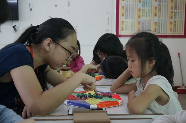 而此时在学校的留守儿童活动室中,许多孩子已经早早来到这里学习,队员们陪在孩子身边,及时解决他们学习上的疑问,和他们聊天,了解他们身心发展的状况。休息时间,孩子们也十分活跃,和队员们一起玩得不亦乐乎:象棋、五子连珠还有跳棋;走廊上,还有队员带着孩子们玩跳房子。活动室中笑声朗朗,孩子们也由一开始的些许羞涩到和队员们一起放声大笑,大家相处十分愉快,到了结束的时候,还有些许不舍。