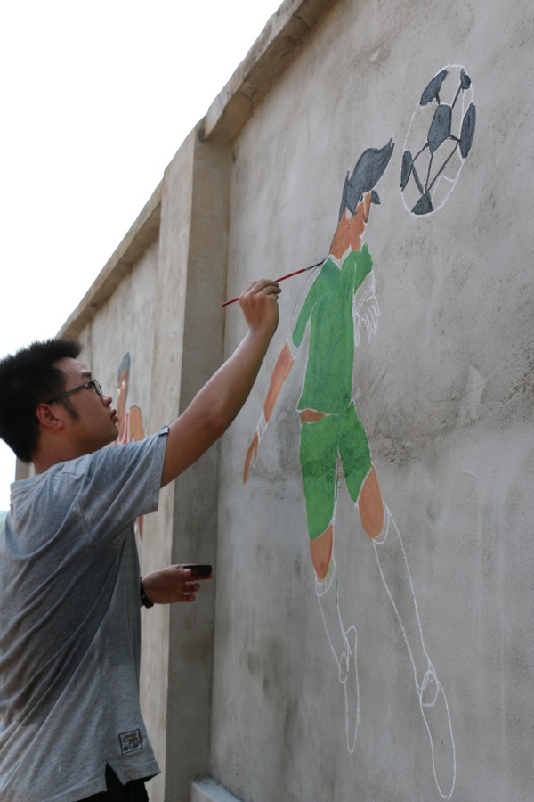 尽管烈日炎炎,肖翔心还是一有时间便去运动场画画。日积月累,本来皮肤较白的他被晒得黑乎乎的,以至于被队友们戏称为“化院第一黑”。对此,肖翔心没有太在意,而是继续专注于自己在墙壁上的画作。受到他专注精神的感染,支教队的其他成员们纷纷施以援手。