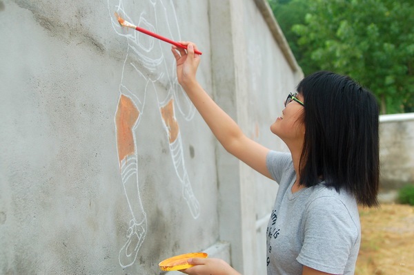 肖翔心在三天时间里用粉笔给每一面空墙壁画上了图案,随即开始了涂色工作。由于涂色面积较广,任务艰巨,队员们一有空闲时间便跟随肖翔心前来帮忙涂色。“我喜欢游泳的图案,我可以涂这个吗?”“涂色有什么技巧吗?怎样可以涂得比较好看呀?”……一面面原本空荡荡的墙壁在博雅行知支教团队员们的努力合作下变得丰富多彩。