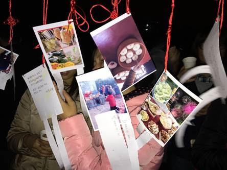 在活动开始前,同学们已亲手制作中国结与灯笼,并与带有自己家乡特有年风年俗的照片挂在一起。每张照片背面都写有同学们的新年祝福与愿望,还带有两到三个灯谜。