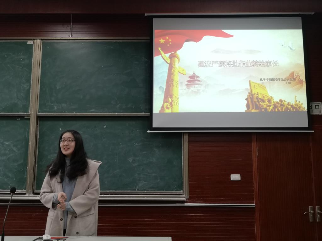 其后女生部副部长王琛就严禁将批改作业转给家长以及发动家长参与学校劳动等来自河南代表团的人大代表李光宇提交的两会提案发表了个人见解。她提议要从师范生自身做起,明确家校联合的真正目的,共同促进学生成长。