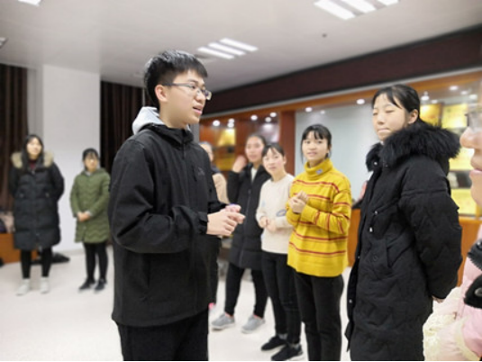 紧接着,蔡挺设计了两到三个有趣的肢体游戏,比如:在不能够发出任何声音的情况下将所有人按照年龄从小到大的顺序排列、在蒙着眼睛的情况下听从搭档的指示穿过障碍物、在不借助道具的情况摆出指定的造型。这些游戏的主旨在于让学生在认识全部人之后可以合作去完成某项任务,增进相互间的了解。