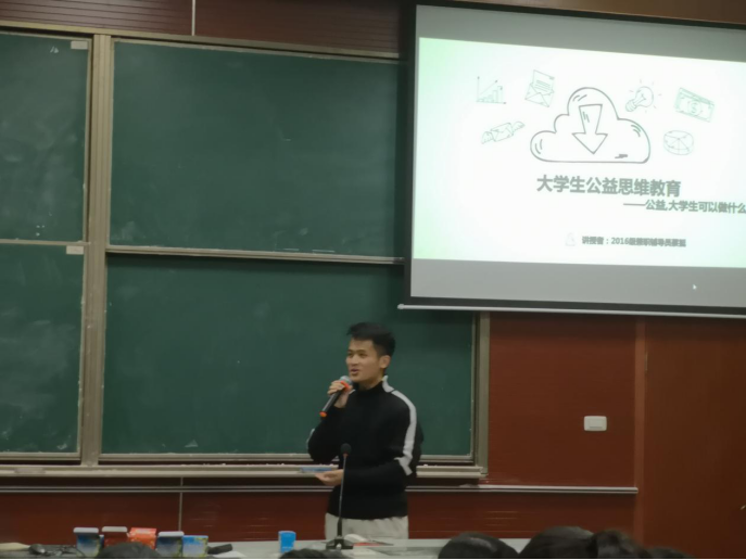 2019年1月6日晚,化学学院在H201教室2018级晚点名现场进行了大学生公益思维主题素质课程。本次课程旨在扩宽大学生的视野,培养大学生的社会关怀理念,促进大学生对我国社会现状的了解并激发大学生积极投身于社会公益事业的热情。本次主题素质课程由化学学院2016级兼职辅导员蔡挺主讲,学院2018级辅导员梁晋华和2018级全体学生参与学习。