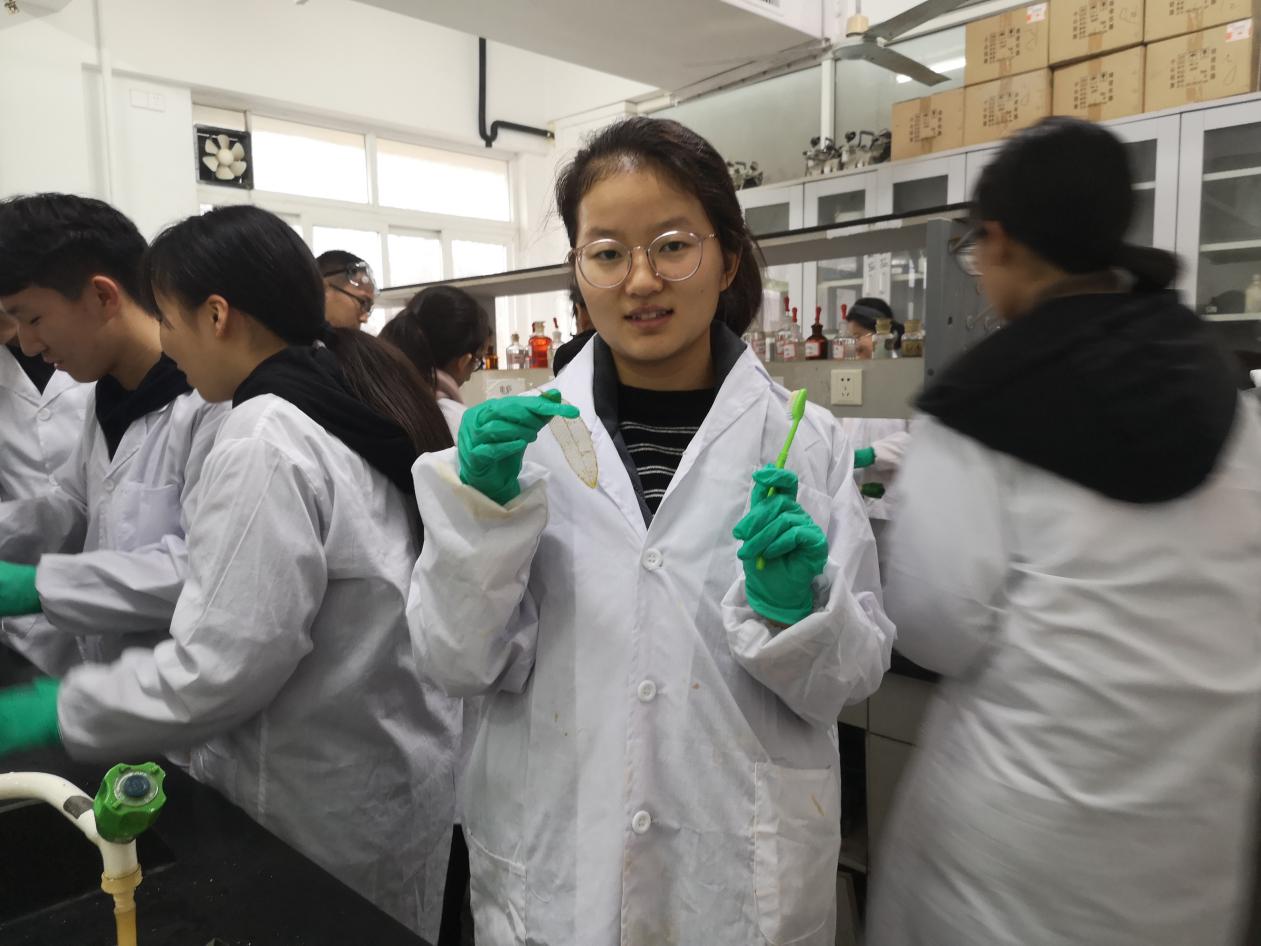 制备叶脉书签时,需要将在氢氧化钠溶液中煮过的叶片放在表面皿上,在缓水流的冲洗下,同学们拿着牙刷,小心翼翼地剔去表面的叶肉,生怕损伤叶脉丝毫。最终,经过同学们细心的处理,原本普通的叶片发生了蜕变,变成了一片片光彩熠熠的叶脉书签。再将目光转到雪花膏的制备上,作为冬季必备护肤品,其受欢迎程度不言而喻。同学们见证了一系列奇妙的过程:硬脂酸与甘油由固体混合加热融化变为澄清的油相,再与加热后的氢氧化钾溶液混合,持续搅拌并水浴加热至乳化均匀,冷却后则变为洁白的乳状雪花膏。各位实验者纷纷表示化学是一门神奇有趣的学科。