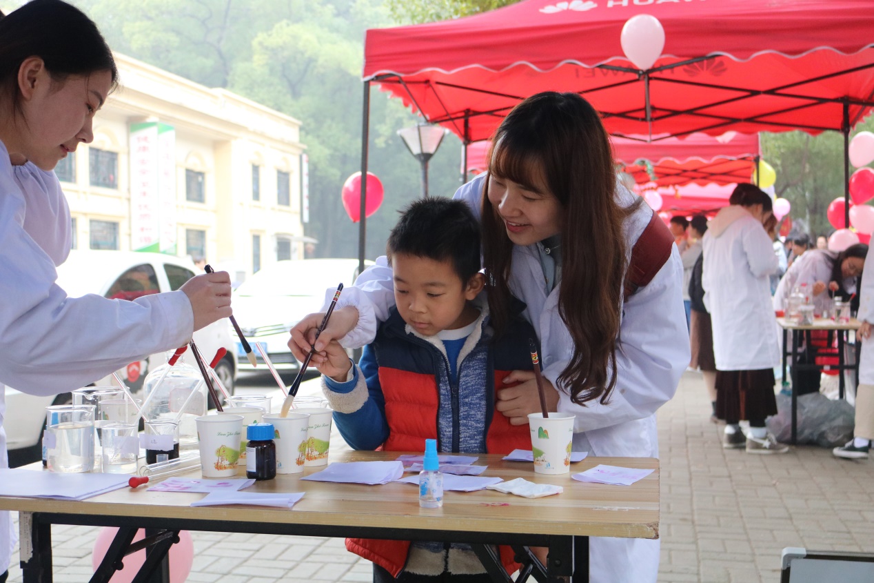 与此同时,17级同学们举办的“蓝瓶子”、“茶水变墨水”、“大象的牙膏”等活动也得到了好评。这些兼具了安全性、趣味性与化学专业性的实验不仅聚集了广大前来参与活动同学的注意力还引来了许多校园内小朋友的注意力。参与实验的同学们认真思考,询问化学原理,并动手操作,好奇的小同学们也在专业同学的指导之下大胆尝试,见证化学的神奇。17级的同学热情耐心地讲解并演示实验。这种寓教于乐、言传身教的科普教育方式进一步激发了同学们对了解化学的兴趣。