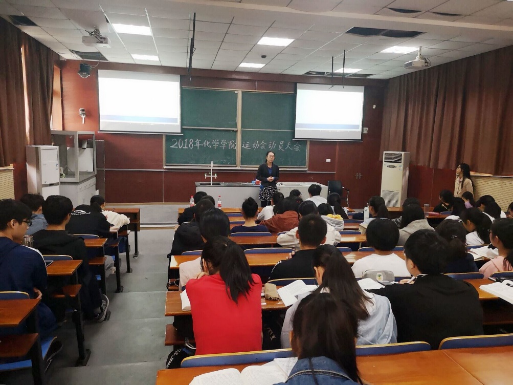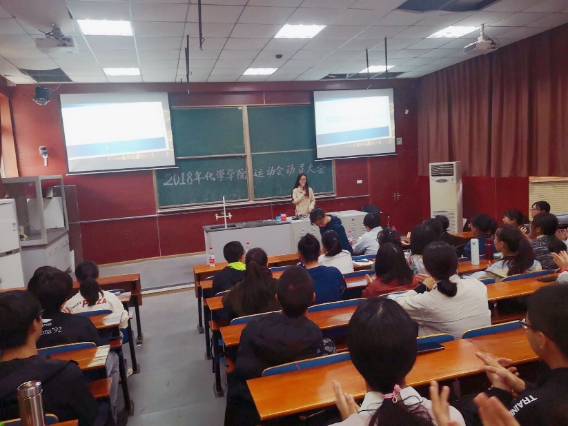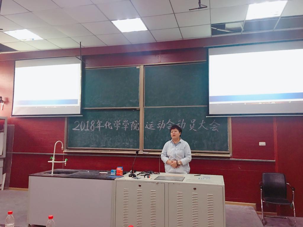 新闻中心消息 通讯员 夏润琳 陈浩然10月18日中午,由共青团华中师范大学化学学院委员会主办,化学学院学生会体育部承办的“2018年运动会动员大会”在逸夫化学楼201教室举行。出席本次大会的嘉宾有化学学院党委副书记徐芬、团委书记安晓蕾和团委副书记马莹。作为拉开化学学院备战校运动会的序幕,大会旨在引导全体运动员明确目标,以饱满的热情和高昂的斗志整装待发,为代表化学学院取得优异成绩而共同努力。此次大会由体育部部长张晓聪主持。