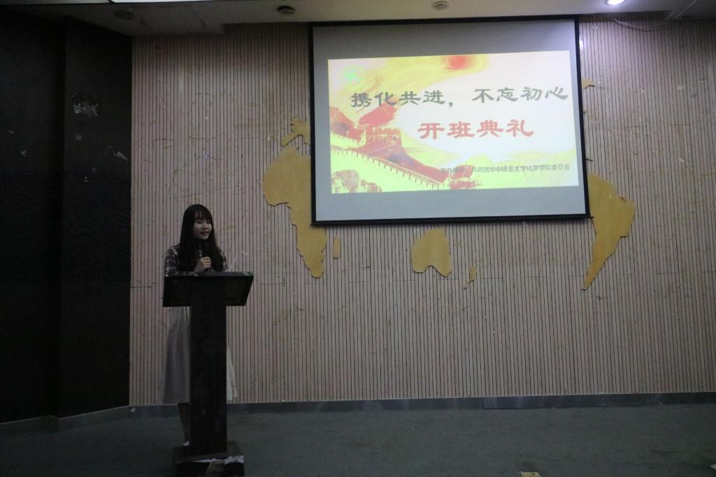 新闻中心消息 通讯员 张倩 蔡梦怡10月12日晚,华中师范大学化学学院2018年团干培训开班典礼在十号楼报告厅举行。此次培训旨在让大家加深对化学学院团委学生会的了解,为各部门助理提供一个共同学习、交流的机会。出席此次典礼的嘉宾有化学学院党委副书记徐芬、化学学院团委书记安晓蕾、化学学院团委副书记马莹、化学学院团委、学生会主席团和各部门部长、2018届全体助理。