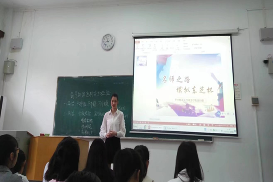 5月12日,在讲课大赛与说课大赛分别胜出的前三名选手在后续继续参加模拟“东芝杯”大赛,此比赛旨在倡行“树师德、练技能、强素养”这一目标,并培养“师德高尚、锐意创新”的优秀化学教师。担任本次比赛的评委有化学学院教学论老师曾艳老师、教育学院团委书记王倩倩老师以及研究生谢嘉玲学姐。比赛主要分为3分钟即兴演讲与15分钟模拟授课两个环节,6位选手积极准备并均针对人教版化学教材中的某一课时内容进行了精彩的模拟授课。评委曾艳老师讲到:“比赛不仅仅考查教学技能,大家的教学技能基本都是没问题的,但要把一个很难的课题讲深讲透就很难了。” 随后,来自1708班的何文婷同学表示:“本次比赛中,参赛的学姐们都很厉害。这次活动让我明白了应该用什么样的台风站上讲台,也明白了讲课中要科学严谨等。”