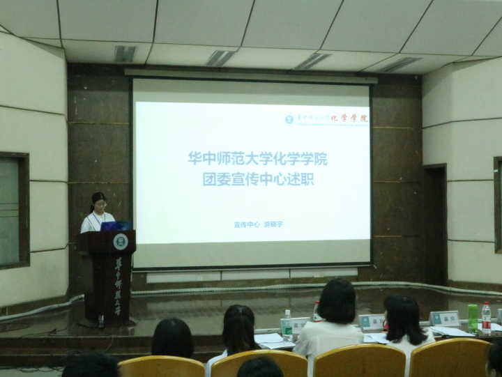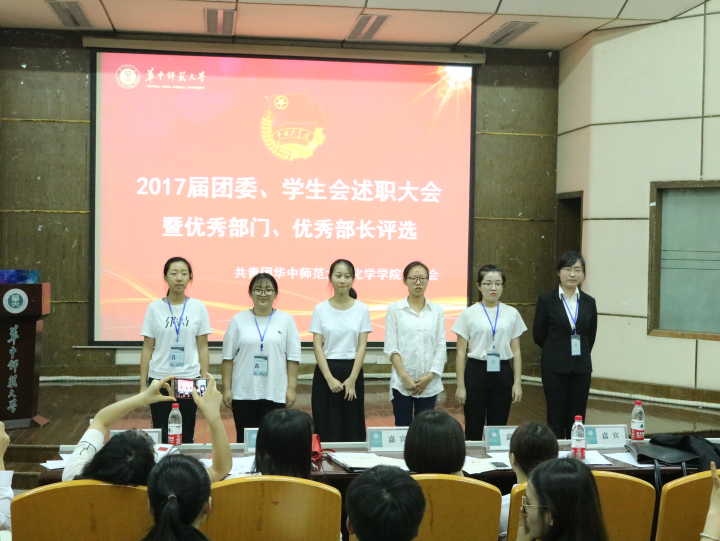 新闻中心消息 记者 刘阳春 蒲天月7月7日晚,华中师范大学化学学院2018届团委、学生会述职大会暨优秀部门、优秀部长评选于九号楼一楼报告厅顺利召开。本次会议旨在对2017届团委学生会本年度的相关工作和成果进行公开展示,并对本年度的学生工作进行总结、反思,通过述职提升学生干部的综合素质。在此基础上,评选优秀部长和优秀部门,并介绍化学学院2018届团委学生会。化学学院团委副书记(教师)马莹、2017届团委学生会全体成员参加了此次大会。