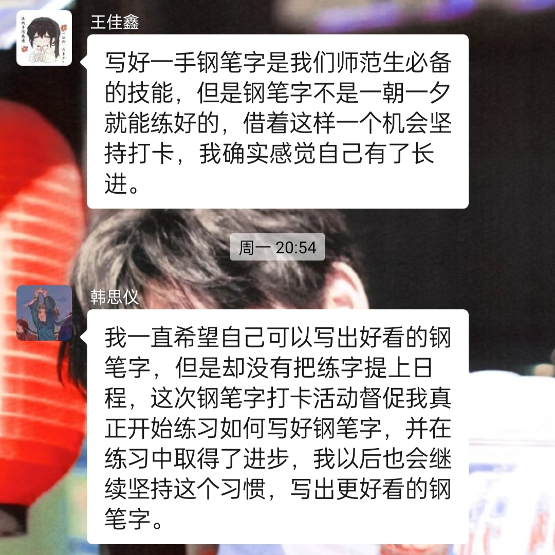 9月4日,2102班同学在群内创建相册并开始打卡,期间大部分同学积极参与,坚持每天打卡,书写出了不少优秀作品。少部分同学由于个人安排,中断了打卡,但也保证会继续坚持练字,让书写成为一种习惯。9月30日,共11名同学完成打卡任务,本次“夯实专业技能,站稳三尺讲台”钢笔字书写打卡活动圆满完成。