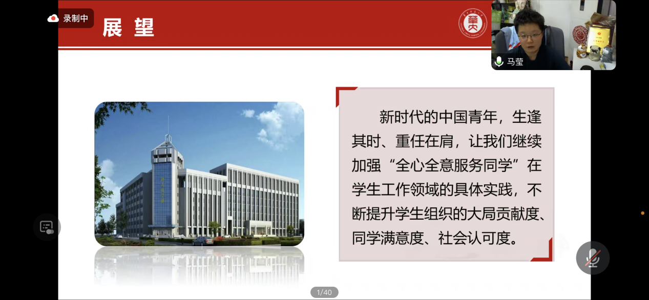 会议有条不紊地进行着,优秀学生代表分别从学业指导、迎新报到、朋辈引航三个方面进行了分享。学业辅导负责人唐子茗向大家介绍了学业辅导的模式、内容以及收获,迎新志愿者代表韩华介绍了迎新志愿工作分工与流程,朋辈引航志愿者代表薛皓月从学业引航、生活引航等方面介绍了志愿工作。