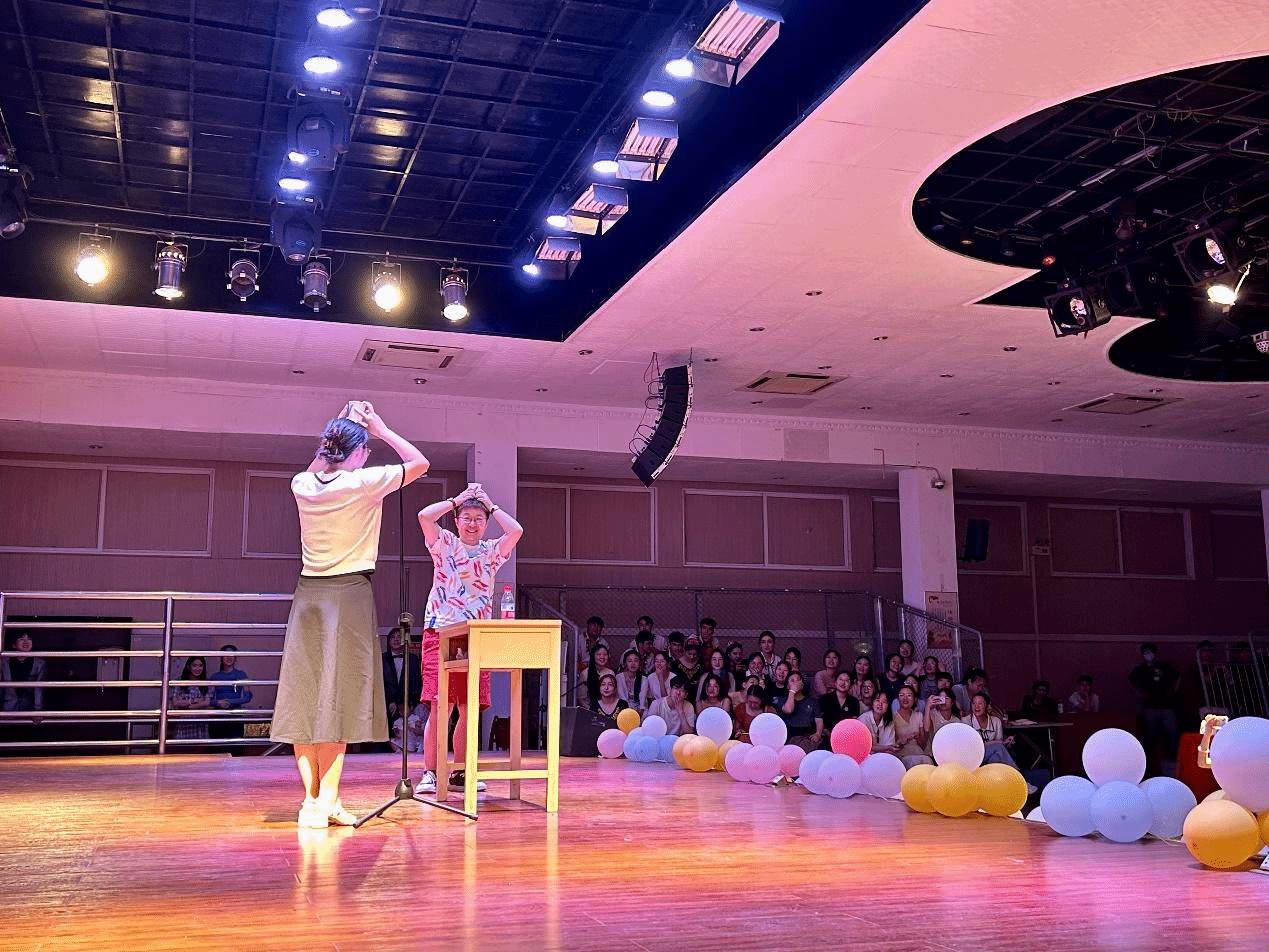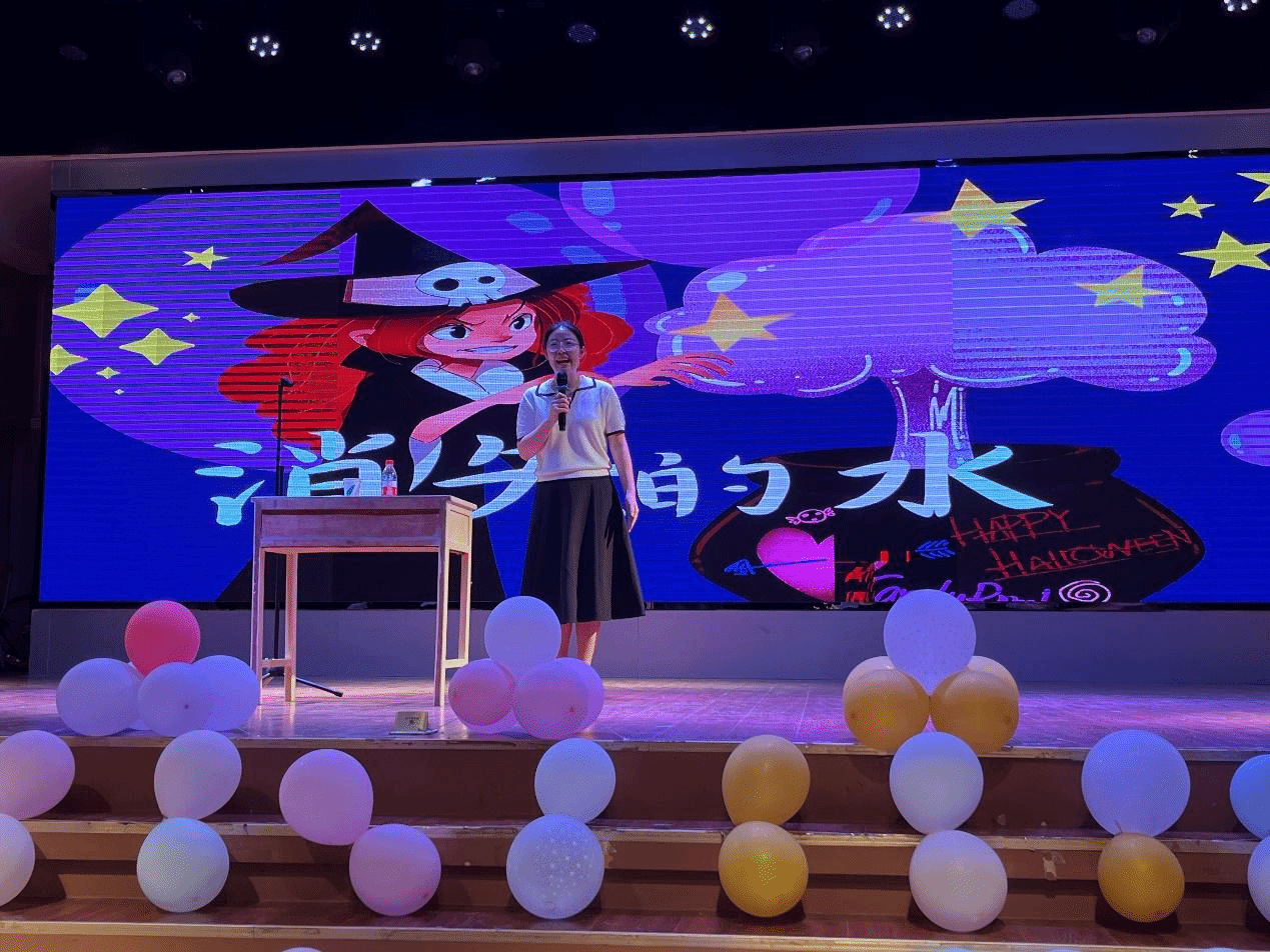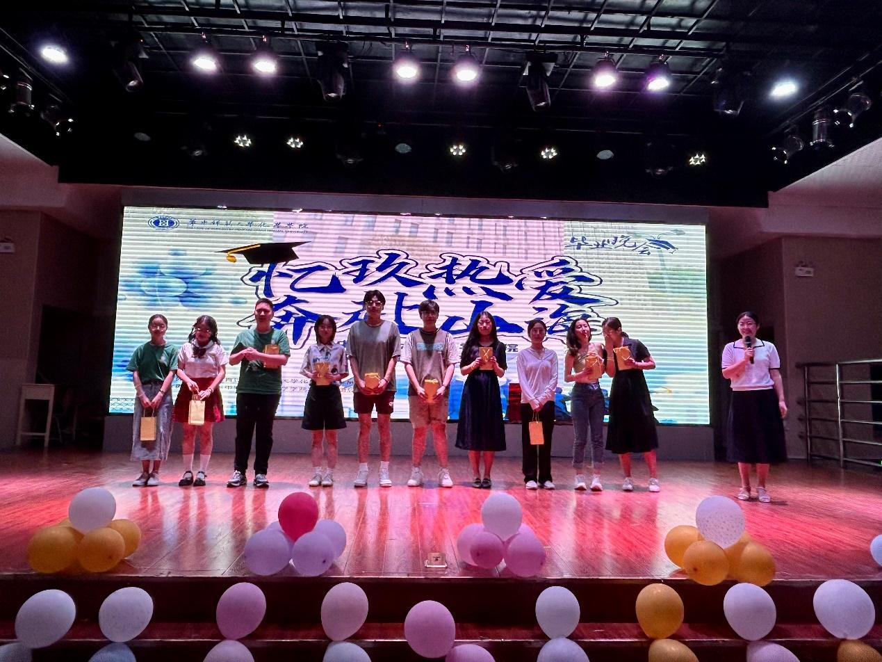 在猜猜乐游戏环节之后,晚会进入第二个部分——星辰•大海。首先,由武双欣老师带来魔术表演《消失的水》。武老师邀请马莹老师作为表演嘉宾,像化学家一样开展神奇的冒险,挑战化学学科的法则,生动呈现了矿泉水在纸杯中瞬间消失的“魔法”。接着,刘瑞文带来歌曲《身骑白马》,声音坚定,给毕业生增添前行的勇气和力量。1903班和1904班联合出演小品《十字坡怪谈之孙记包子铺》。他们结合师范生身份以及当下“双减”政策背景,以风趣的形式呼吁毕业生牢记作为化学教师的初心,立德树人,成为经得起各种考验的教育工作者。徐欣颖等毕业生的舞蹈串烧《Say my name + 恋爱告急》则展现出大学生的多才多艺,稚嫩少年已走上成熟台阶。