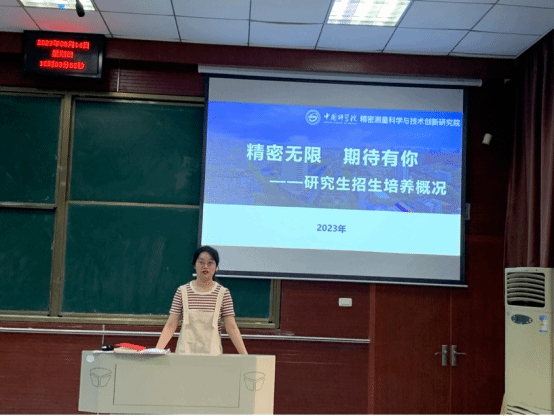 晚上六点,夏云、陈卓在H201教室面向2020级非公费师范生进行以“精密无限,期待有你”的分享。分享伊始,夏云介绍了中国科学院的发展历史以及其培养硕果。此外,她围绕精密测量院的历史沿革、学科布局、历史贡献、科研平台、师资力量和科研实力等基本情况进行详细讲述,鼓励学生积极报考。随后,陈卓向同学们介绍了精密测量院研究生教育规模、奖助体系、杰出校友、生活环境等众多细节。分享最后,她们鼓励有意愿的学生积极参与精密测量院的大学生夏令营,报考精密测量院。