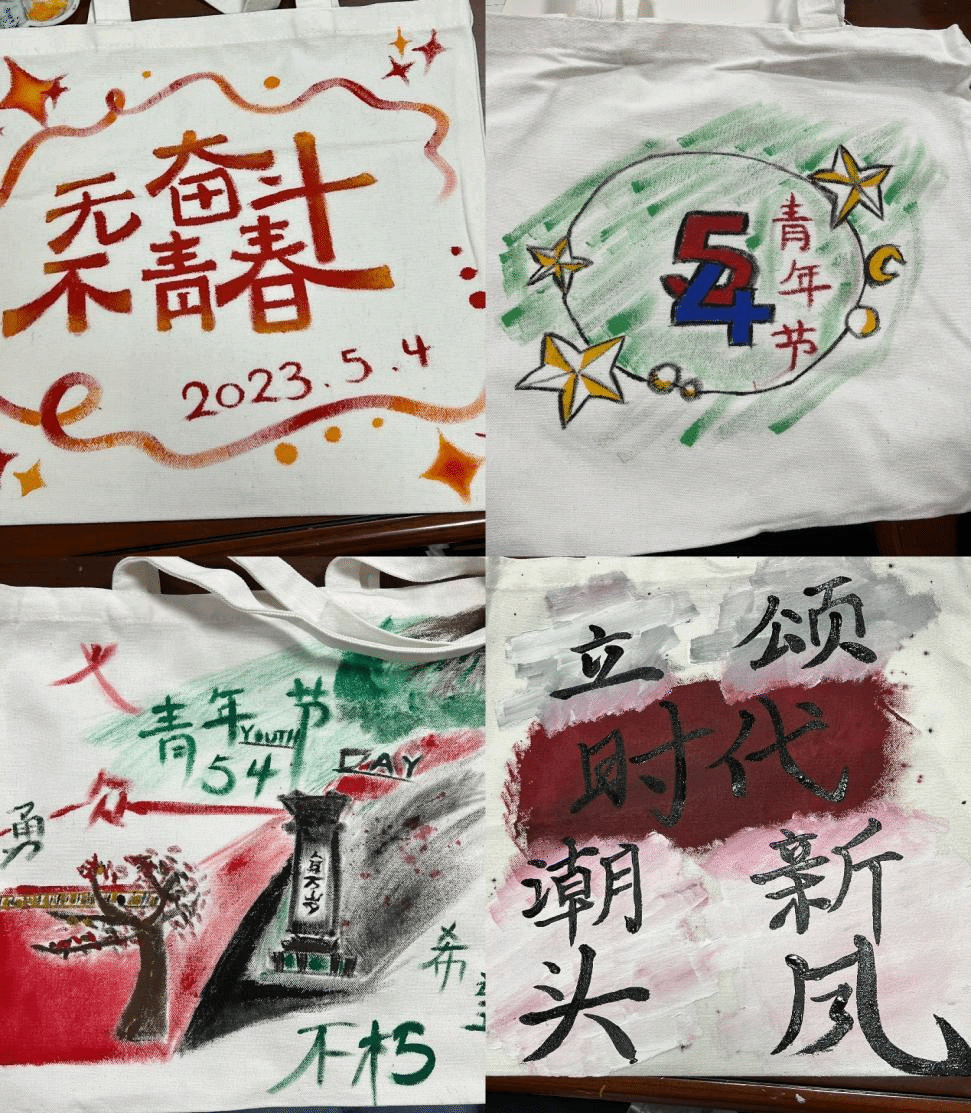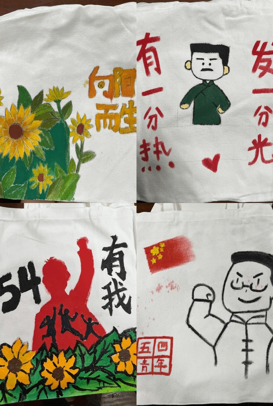 至此,化学学院“新青年,执画笔,扬五四,续华章”帆布袋绘画活动顺利结束。同学们以笔做媒,以画寄情,点燃青春梦想,激发创作热情,用实际行动彰显青春力量,展现青年风采。化学学院2022级毕雪琴同学表示:“本次活动很有意义!在帆布袋上作画新颖有趣,通过这次活动我不仅感受到了画画的乐趣,并且通过本次活动更深刻地理解了五四精神。”