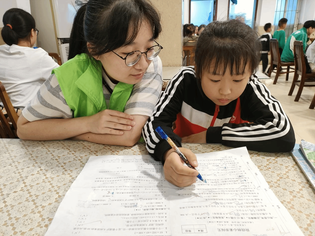 志愿者杨雨欣为菘菘(化名)讲解空间几何的相关概念,并布置练习册上的题目,让菘菘进行针对性练习。在杨雨欣的辅导下,菘菘将零散的知识点串联起来,并且熟练地解决了相关问题。志愿者韩晓晓在瞳瞳(化名)完成语文作业后,督促瞳瞳复习之前学过的课文内容并预习新课文。在瞳瞳朗读文章或背诵古诗的过程中,韩晓晓会纠正瞳瞳的部分错误发音。