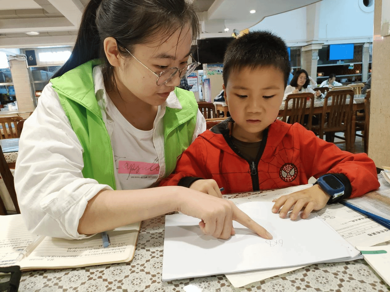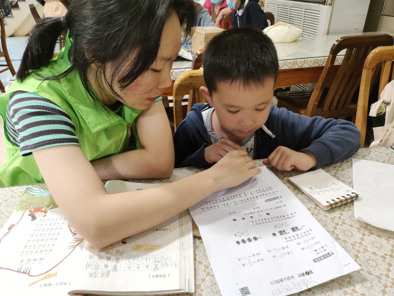活动伊始,博雅服务队队员李宁带领志愿者们认识各位小朋友,在充分了解小朋友的需求后为志愿者分配工作。志愿者景若琳辅导同同(化名)复习数学中认识人民币、元和角的换算及一百以内加减法等知识。在复习完数学知识后,景若琳给同同听写生字,并帮助他完成课文拼音标注,监督他完成课文背诵。