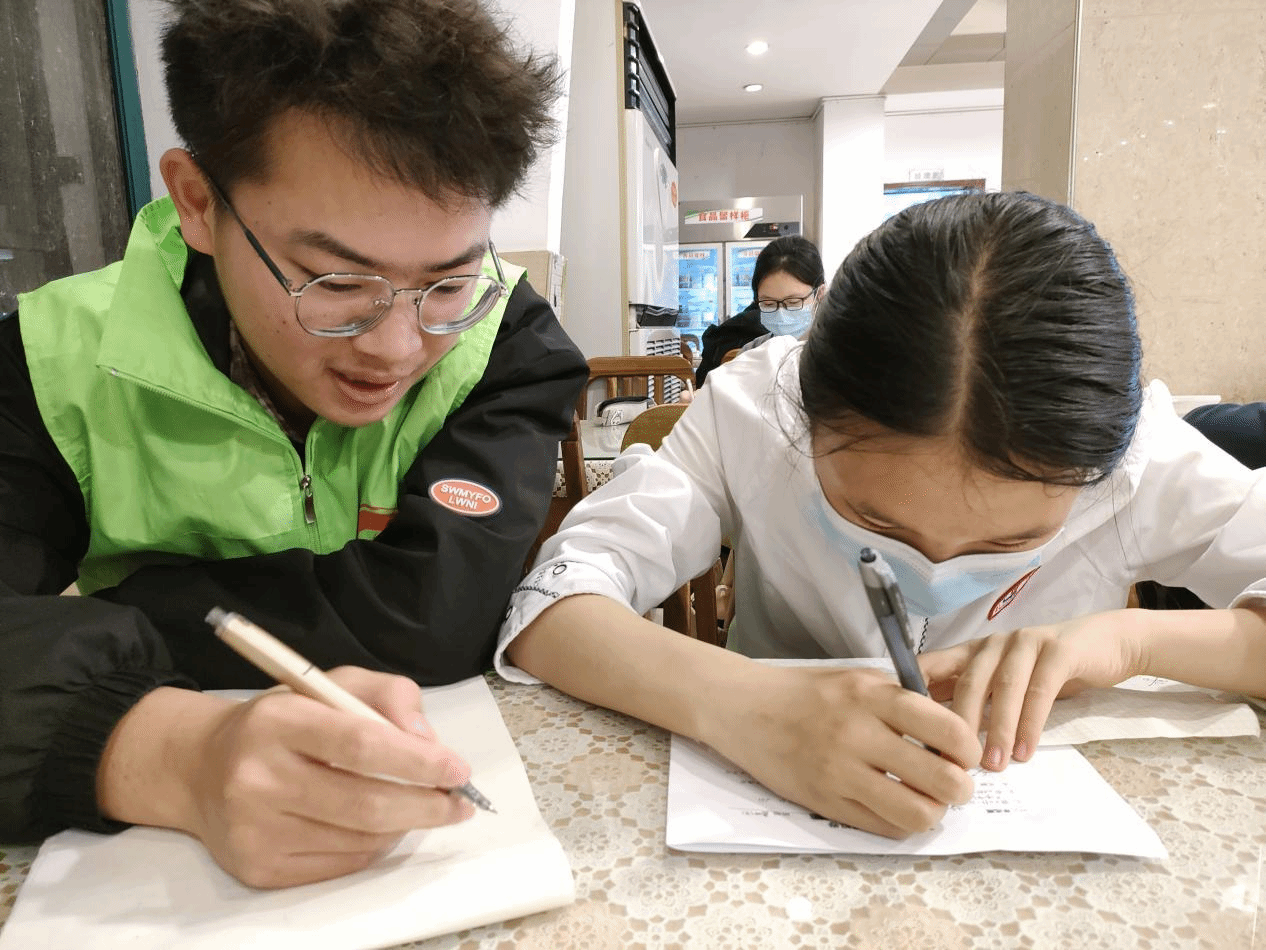 志愿者冯于萱辅导涵涵(化名)针对语文错字进行了训练,并监督涵涵抄写课后词语,然后对涵涵进行了随机听写。在听写过程中,冯于萱发现涵涵对这些词语的掌握不够牢固,于是监督涵涵将错字重新抄写。经过记忆后,冯于萱再次对涵涵进行听写。在涵涵听写全对后,冯于萱带领她对课后生字进行组词训练。同时,志愿者吴龙为菘菘(化名)讲解了三角函数的化简应用求值、向量和函数的综合运用等相关题目的解题方法,并通过相关题目帮助菘菘进行巩固。