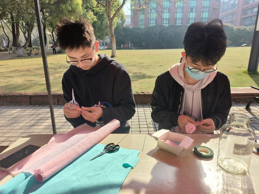 随后,选手们前往博雅广场参加比赛。选手们胸藏妙思,手似游龙,一剪一折,一钩一织,将简简单单的原料变成了精致瑰丽的手工艺品。高敬丹选手通过非物质文化遗产——缠花技术将古代女子腰间配饰“禁步”再现于观众眼前;飘洋过海,叶嘉立选手为我们展示了来自拉丁美洲的“上帝之眼”——曼达拉;跟随潮流,王静瑄将无限春色浓缩于一方“流沙麻将”中。参加活动的其中一组男生选手们,则将祝福与鼓励埋藏于一朵朵折纸玫瑰与褶皱纸玫瑰中,献给所有的女生。