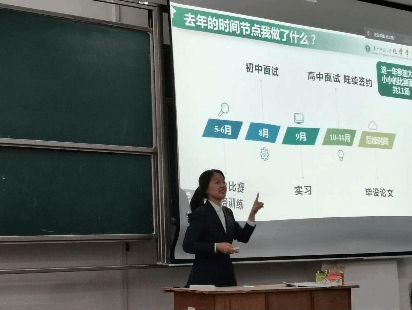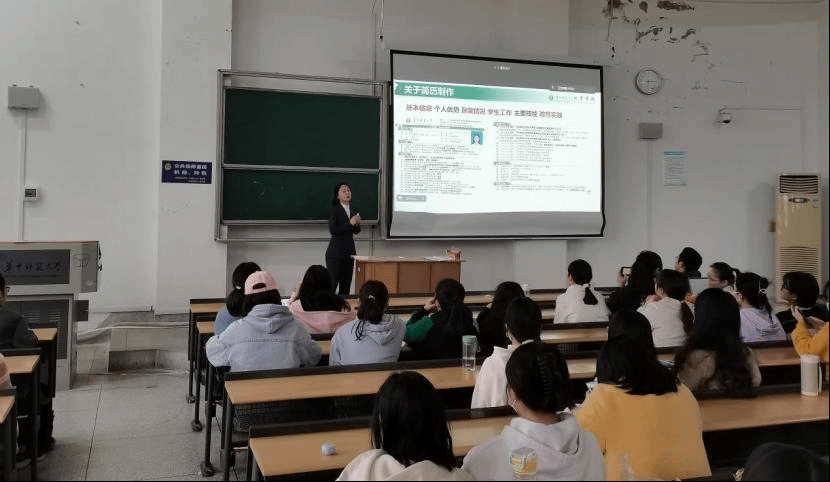 针对即将踏入职场的全体公费师范生,周丹在9501教室开展了以“你做三四月的事,在八九月自有答案”为主题的求职经验分享。首先她介绍了自己的基本情况与实践经历;其次向同学们介绍简历制作的注意事项,她强调简历应突出个人优势,弱化缺点;随后就学校及学段的选择进行分享,介绍了学校类型的选择,向同学们分析了应聘初中教师与高中教师的优缺点,同时提醒同学们注意各个学校招聘的信息渠道;最后周丹提醒大家关注招聘的时间节点,并结合自身求职经历,就面试流程、面试仪容仪表、备课准备以及试讲环节为同学们提供了诸多实用性建议。