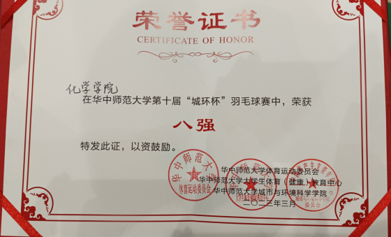 新闻中心消息 通讯员 崔国豪 陈歆雨 贺梓焜华中师范大学第十届“城环杯”羽毛球赛于3月17日到19日在乒羽中心和佑铭体育馆进行。在本届比赛中,化学学院羽毛球队发挥出色,队员们齐心协力,默契配合,最终获得了八强的好成绩。