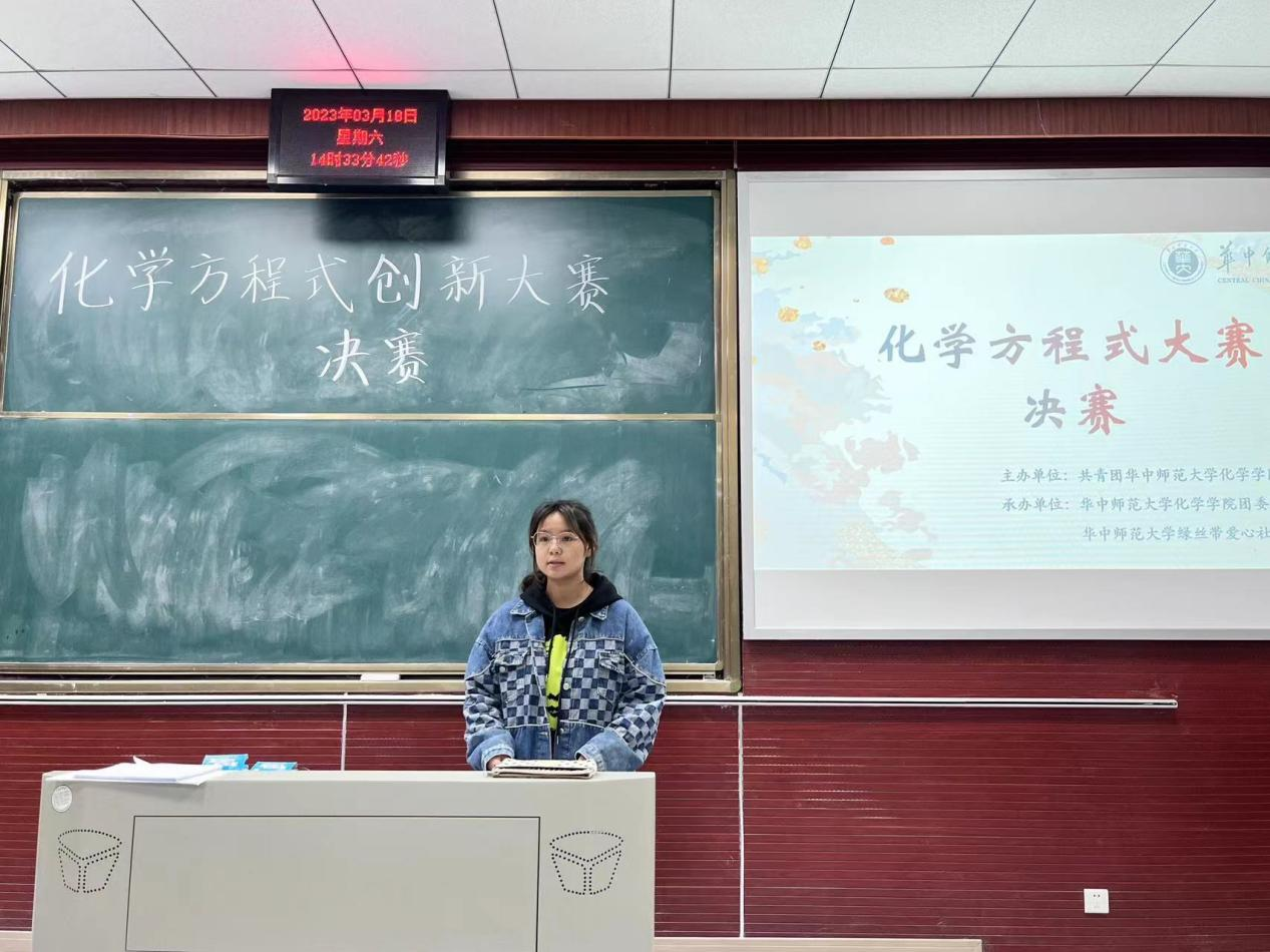 新闻中心消息 记者 方之航 杨礼晗3月18日下午,化学学院第十四届化学周系列活动之化学方程式创新大赛决赛在逸夫化学楼101教室顺利举行。本次比赛由共青团华中师范大学化学学院委员会主办,化学学院团委社团部、华中师范大学绿丝带爱心社(学生)承办。举办化学方程式创新大赛旨在提高同学们对化学学科的学习兴趣,增强专业素养,锻炼同学们对化学基础知识的灵活运用能力。出席本次比赛的嘉宾是化学学院团委书记马莹。此次比赛由化学学院团委社团部学员张可心主持。
