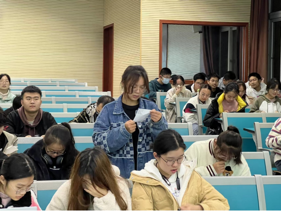 活动伊始,姚绮妮首先为大家介绍了心理团辅活动的开展目的和意义,希望同学们放下包袱和压力,在活动中获得快乐。紧接着,姚绮妮带领大家开始了第一个小游戏“生命之重”。姚绮妮首先简单介绍了游戏规则,然后给同学们分发了白纸,让同学们写下“未来有可能成为的二十个身份”。接着,她让同学们在思考过后,舍弃十个身份,再放弃五个,直到剩最后一个身份。姚绮妮先大方分享了自己的心路历程,引得同学们踊跃举手,其中潘微微同学主动说出了自己想成为的人,舍弃的身份以及放弃的原因。其中不乏有端正的职业身份如老师、医生等,更有新奇而无厘头的身份如富婆、神奇女侠……引来同学们的一片欢声笑语。游戏渐渐进入尾声,同学们也从轻松的游戏里明悟对自己未来的规划和期望。