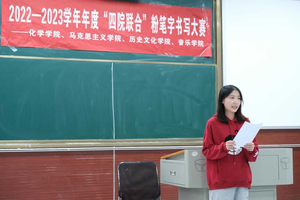 11月12日下午15:00,2022—2023学年化学学院第十四届研究生学术年会之“四院联合”粉笔字书写大赛决赛在逸夫化学楼H101教室成功举办。化学学院研究生辅导员张栩晨、音乐学院本科生辅导员李雅璇、马克思主义学院研究生团总支书记刘燕涛、历史文化学院廖晴炜作为评委嘉宾出席决赛。本次决赛由音乐学院研究生会学术实践部胡佳璇主持。