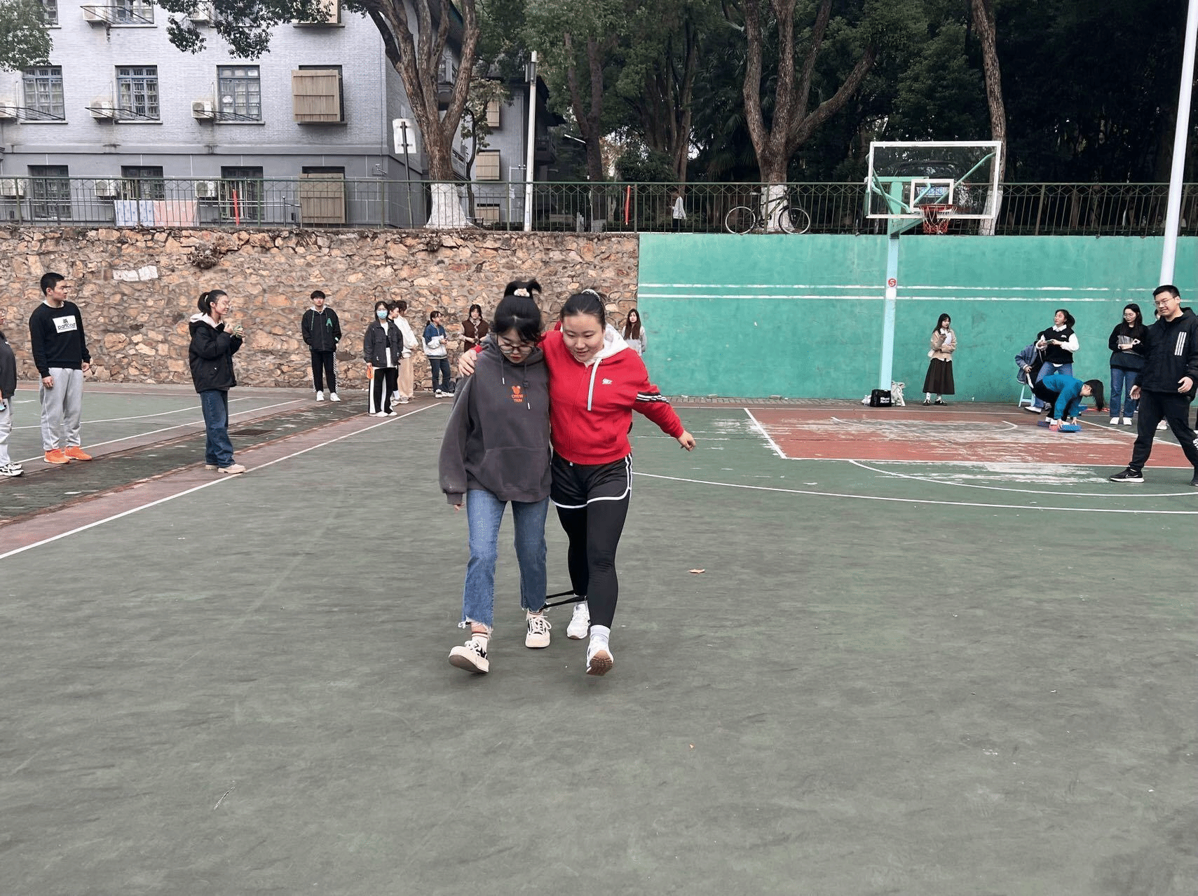 上午九点,在参赛人员全部集合完毕后,活动正式开始。在“两人三足”游戏环节,同组成员需要两两绑腿,接力前行。游戏开始前,各组成员完成人员分配,并对“两人三足”行进方式进行了尝试。经过各组同学的认真练习和相互磨合,在正式游戏环节,同学们都信心满满,跃跃欲试。在赛道上,他们时刻投入,你追我赶,为了胜利齐心向前,拼搏到底。