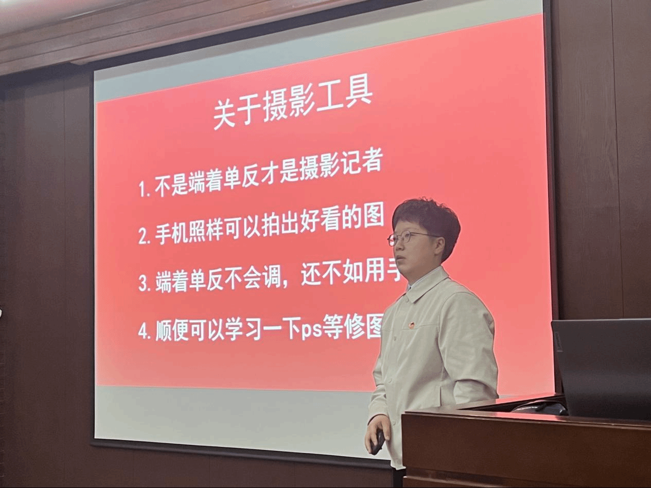活动伊始,黄洁秋介绍了本次团课的主讲人马莹并对她表示热烈欢迎。随后,活动进入主要环节,马莹主要从拍照技巧及注意事项与在实践中增长自身本领两方面展开了团课的讲解。