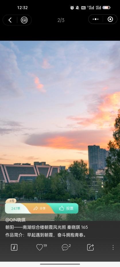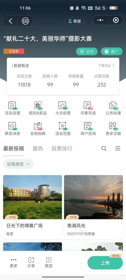 此次摄影比赛活动于2022年10月26日-30日面向同学们线上征稿,采取微信小程序“Fotoo”的形式收集作品。以民主投票的形式,评定活动获奖同学,随后工作人员在活动群中宣布获奖名单。
