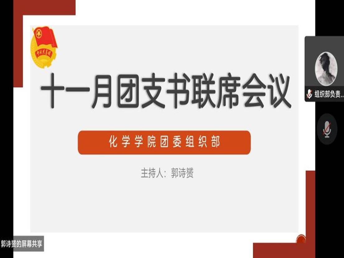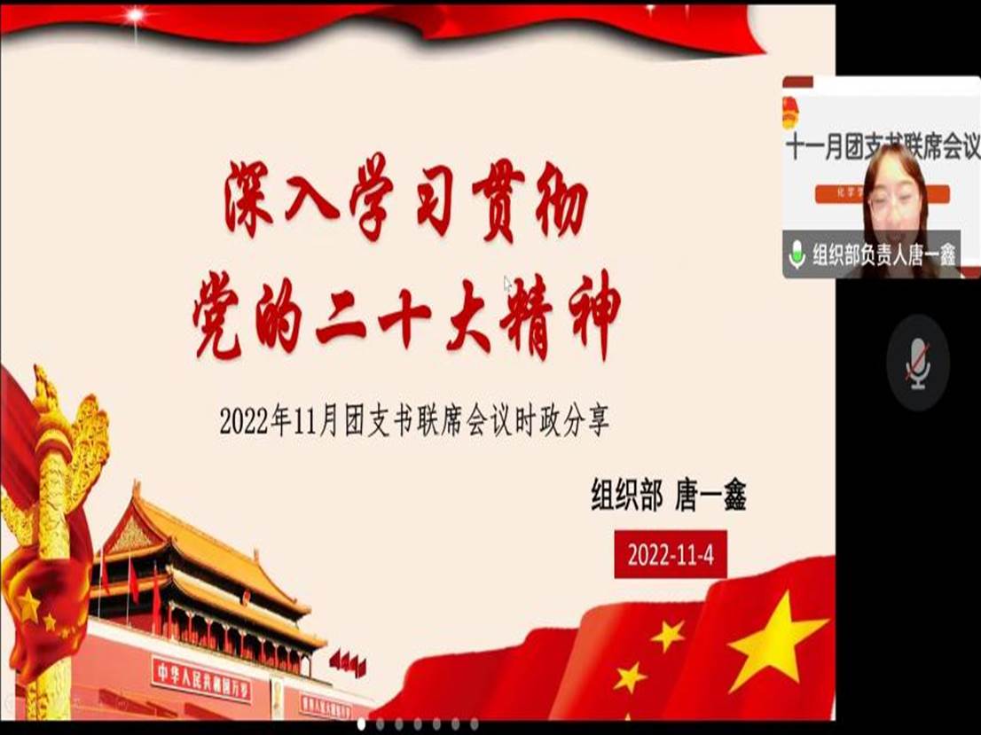 通讯员 田欣悦 11月4日晚上,华中师范大学化学学院十一月团支书联席会议在线上顺利举行。此次会议旨在学习中国共产党第二十次全国代表大会精神、解答近期团学工作疑问、总结和强调青年大学习学习情况以及提出后续工作要求。出席本次会议的有化学学院团委书记马莹、团委副书记武双欣、学生团委副书记任静宜、化学学院组织部负责人唐一鑫、黄洁秋、郭诗赟,组织部全体学员,各年级团总支书记,各年级组织部负责人和各支部团支书。会议由组织部负责人郭诗赟主持。