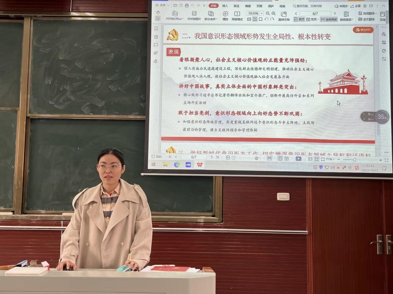 武双欣以协助做好新时代意识形态工作为主题,展开本次培训。她从意识形态工作的重要性入手,表示“意识形态工作是筑牢共同思想基础、凝聚磅礴奋进力量的必然要求,是为国家立心、为民族立魂的工作。”她结合我国国情与具体表现,强调“我国意识形态领域形势发生全局性、根本性转变”。随后,武双欣以提问并解答的形式带领大家辨析纠正常见用语错误,力求书写正确、完整且规范。她表示,学生干部更要起到带头作用,严格要求自己,对同学负责、对工作负责。