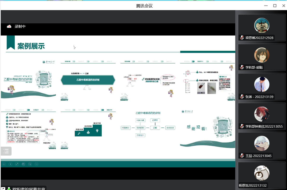 首先,欧阳素介绍了PPT三个使用场景,分别为课程作业、教学比赛及汇报答辩,让同学们了解到PPT适用场景之广和提升其水平的重要性。随后,她就PPT模板设计、PPT设计的原则、案例分析、案例展示四个方面分享了让PPT制作更精美的技巧。在讲解过程中,欧阳素分享了导师与自己在制作PPT过程中发生的趣事,并展示了学生制作的PPT,增强了此次分享会的趣味性,调动了参会人员的热情。接下来,欧阳素完整地展示了自己所制的“乙醛中毒解酒的研制”PPT,这让参会人员深刻感悟到PPT技巧提升的重要性。