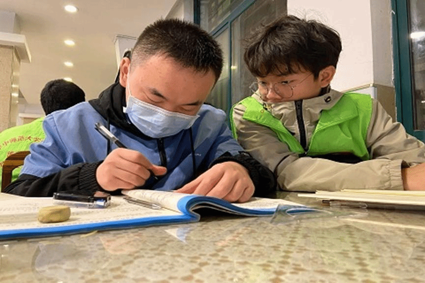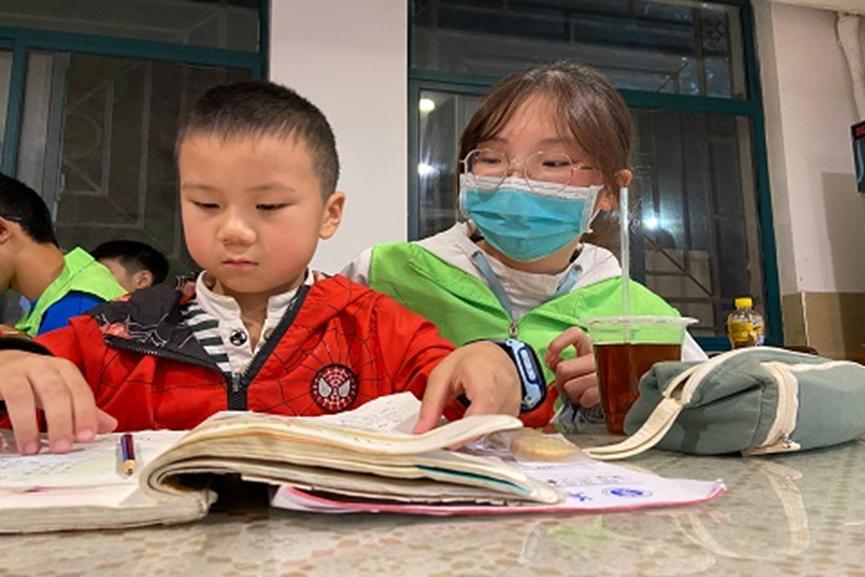 与此同时,志愿者刘馨雨在辅导小佳(化名)的语文作业。小佳在朗读课文时态度端正,认真严肃,遇到不认识的字词时会及时询问志愿者并记下该字词的拼音。于是,刘馨雨对小佳提出表扬,并鼓励小佳在今后的学习中再接再厉。