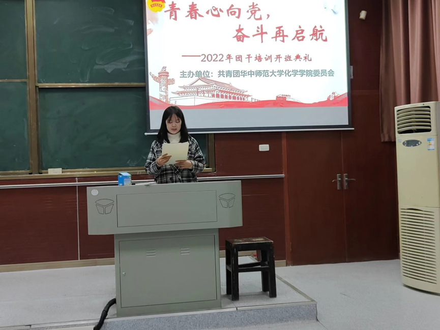 新闻中心消息 通讯员 杨礼晗 10月7日晚,化学学院2022年团干培训开班典礼在逸夫化学楼顺利举行。本次活动由共青团华中师范大学化学学院委员会主办,由化学学院团委组织部承办。活动以“青春心向党,奋斗再起航”为主题,旨在详细介绍化学学院团委学生会部门职能、分工,给各部门学员提供一个共同学习、共同进步的机会。出席此次活动的嘉宾有化学学院党委副书记徐芬、团委书记马莹、团委副书记武双欣。化学学院2022级红石榴团学骨干训练营学员,红石榴提升组学员,2022级年级干部、班级干部,2021级部分年级干部、班级干部参与了此次开班典礼。活动由化学学院团委组织部负责人郭诗赟主持。