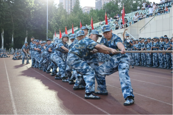 新闻中心消息 记者 颜祯 郭雅婧 田有茂9月12日晚,华中师范大学2022级新生军训拔河比赛在佑铭田径场和南湖田径场顺利举行。本次比赛旨在深化各连队同学之间的交流与了解,增进同学之间的友谊,丰富同学们的军训生活,同时增强日常体育锻炼的意识,发扬团队协作精神,展现各连队的精神风貌。