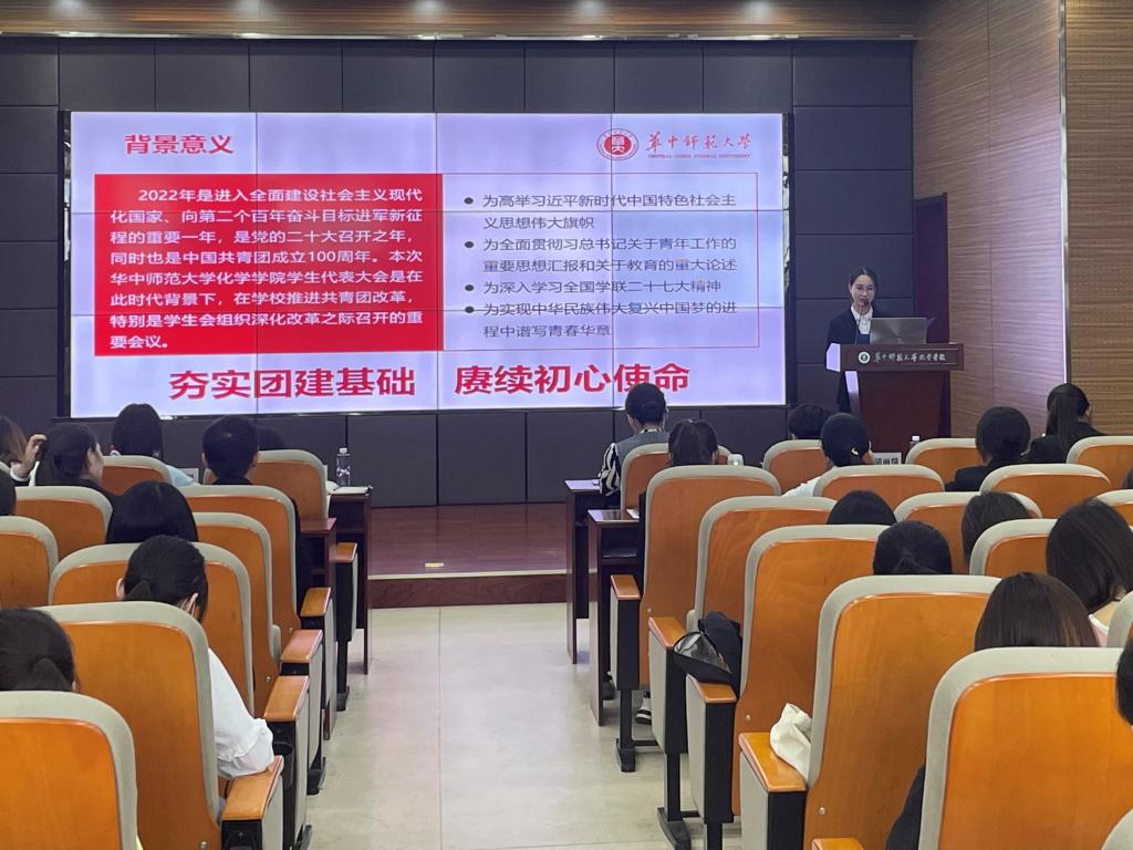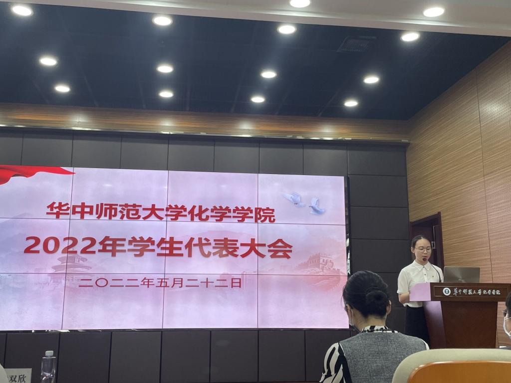 新闻中心消息 记者 贾倩茹 郭雅婧5月22日下午,华中师范大学化学学院 2022 年学生代表大会在理科实验楼823报告厅顺利举行。本次学生代表大会旨在展现、汇报、总结2021年至2022年学生会工作,选举化学学院新一届主席团成员。出席本次会议的嘉宾有化学学院党委副书记徐芬、团委书记马莹、团委副书记武双欣,兼职辅导员姚绮妮、阿迪拉。化学学院团委、学生会、青年志愿者协会各部门负责人以及各年级本科生、研究生代表参与了本次会议。会议由化学学院2021届学生会主席团成员罗睿童主持。