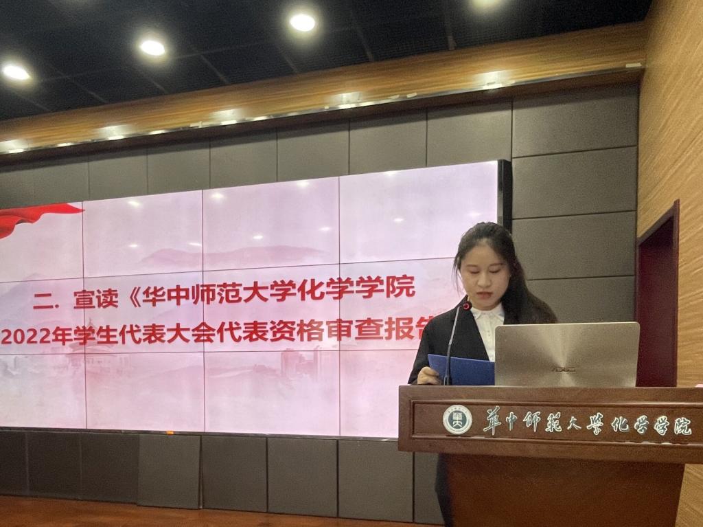 随后,化学学院 2021 届学生会主席团成员胡雨绮宣读了《华中师范大学化学学院 2022 年学生代表大会委员会工作报告》。她指出,本次学生代表大会是在重要的时代背景下,在学校推进共青团改革,特别是学生会组织深化改革之际召开的重要会议,并汇报了学院不断创新工作思路和推进落实共青团改革的举措。