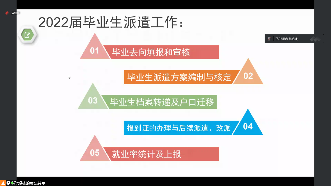 会议伊始,孙老师首先介绍了我院2022届毕业生目前的签约情况。接下来孙老师向2022届毕业生介绍派遣工作事项,包含毕业去向填报和审核、毕业生派遣方案编制与审核、毕业生档案转递和户口转移、报到证的办理与后续派遣、改派以及就业率统计及上报等五项事宜,并说明了各项工作的时间总体安排。