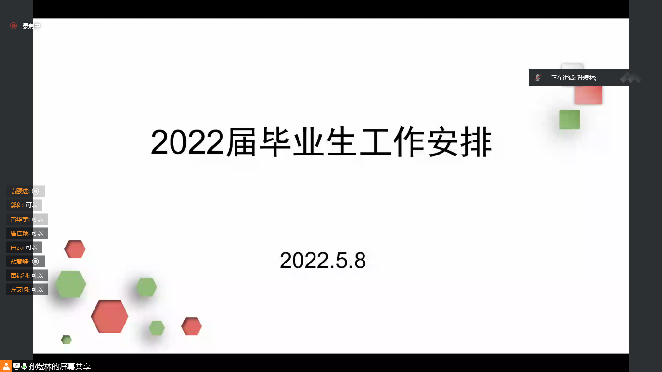 5月8日上午11点,化学学院2022届毕业生工作安排会议以线上会议的形式顺利开展,会议由化学学院研究生兼职辅导员孙煜林老师主持,化学学院2022届全体毕业研究生参与。