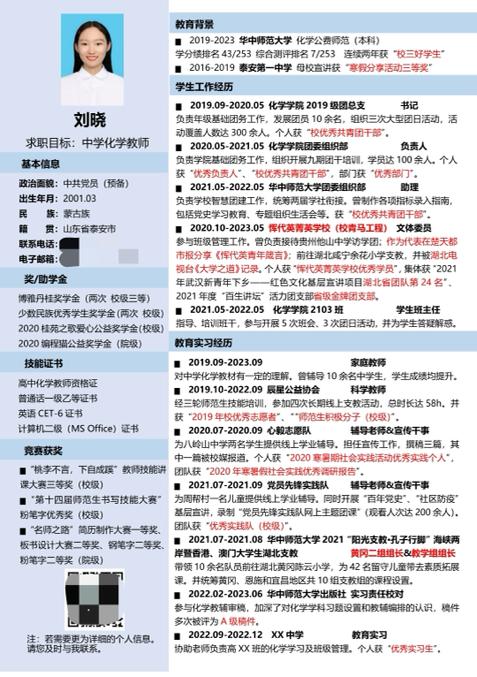 获得特等奖两名同学的参赛简历各有千秋。付艳颖的个人简历排版大气,重点突出,详略得当。在“教育背景”一栏,她巧用排列的形式,向面试官展示了自己突出的成绩优势。在丰富的学生工作经历与教育实践经验描述中,付艳颖着墨精当地点出了自己的工作能力。刘晓的个人简历层次分明,充分利用了简历的排版空间,不仅如此,她将简历分隔成左右两列的格式,内容布局合理,简历中满满当当的实践经历与细致而简洁的描述性语句相辅相成,让人眼前一亮。