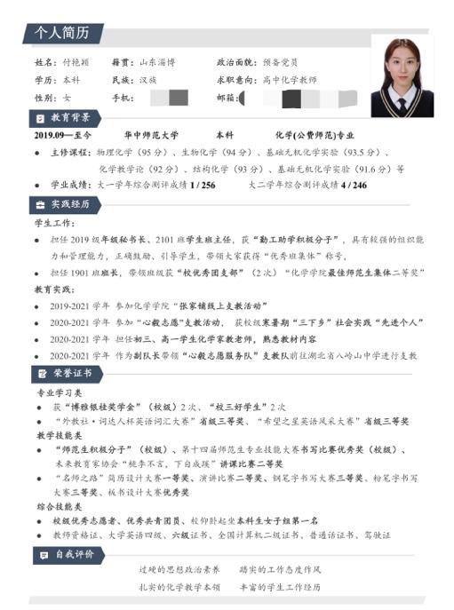 化学学院2022年“名师之路”师范生技能大赛之简历制作大赛充分发挥了“名师之路”系列大赛的举办宗旨,为同学们磨炼自身师范生技能、提高求职竞争力提供了宝贵的机会。薛力源同学在得知自己荣获一等奖之后感慨到:“制作简历期间,我不仅看到了自己在过去几年为梦想付出的努力,也更加清晰认识到自己现阶段还需要做哪些准备以持续提高求职竞争力。”荣获三等奖的龙偲航认为,参加此次比赛有助于提高自己的简历制作水平,在充分听取老师同学们的建议之后,她不断打磨自己的简历,终于制作出了自己较为满意的求职简历。