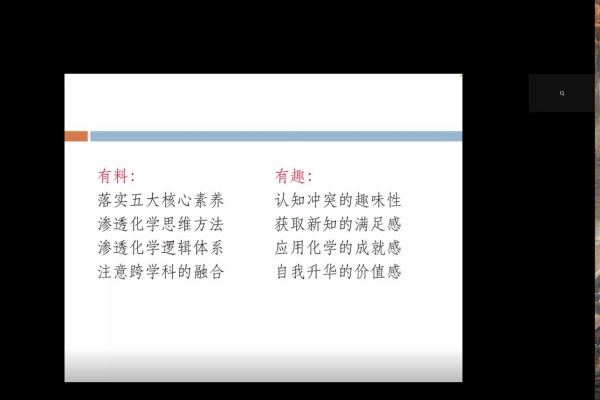 经过多年工作积累,曹清老师总结出她认为有用的教学方法,两个关键词——“有料”和“有趣”。前者是落实化学学科核心素养,渗透化学思维方法,强调化学逻辑体系,注意跨学科的融合;后者是认知冲突的趣味性,获取新知的满足感,应用化学的成就感,自我升华的价值感。