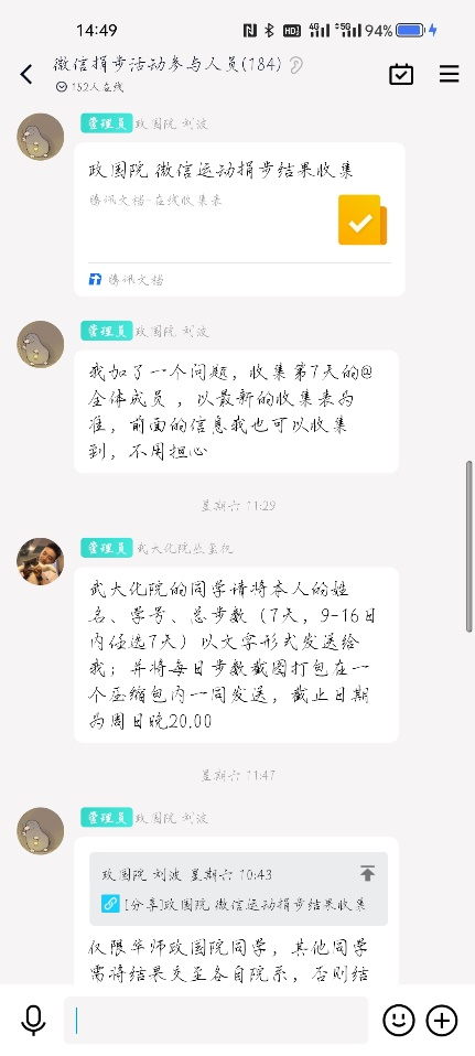 本次活动的规则在于通过微信步数进行捐步,并进行截图留痕。最终获奖结果由所走步数累加数量总和作为评判标准,设置一、二、三等奖及优秀奖。具体奖品设置为:一等奖1名(蓝牙耳机),二等奖2名(华大金属U盘),三等奖3名(华大经典帆布包),优秀奖17名(学校纪念章)。活动一经发布,各学院同学积极报名,两校六院总参与人数达近200人。