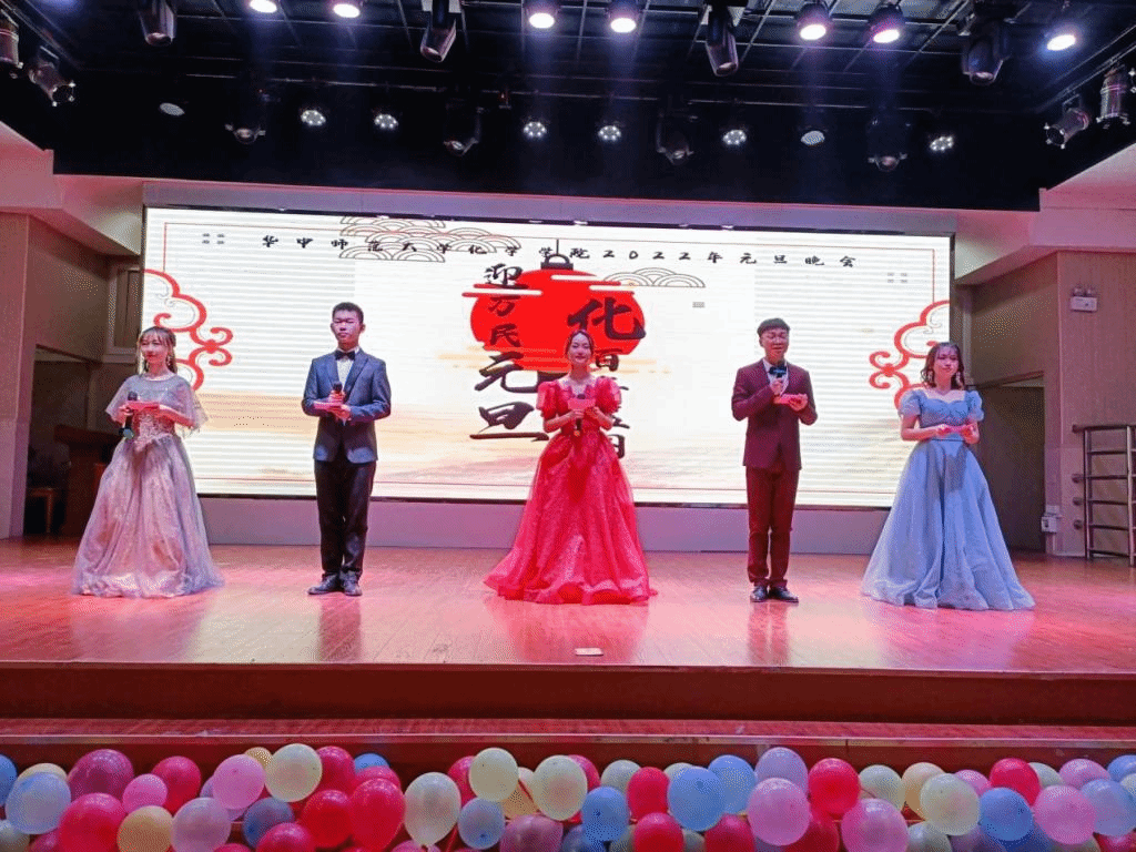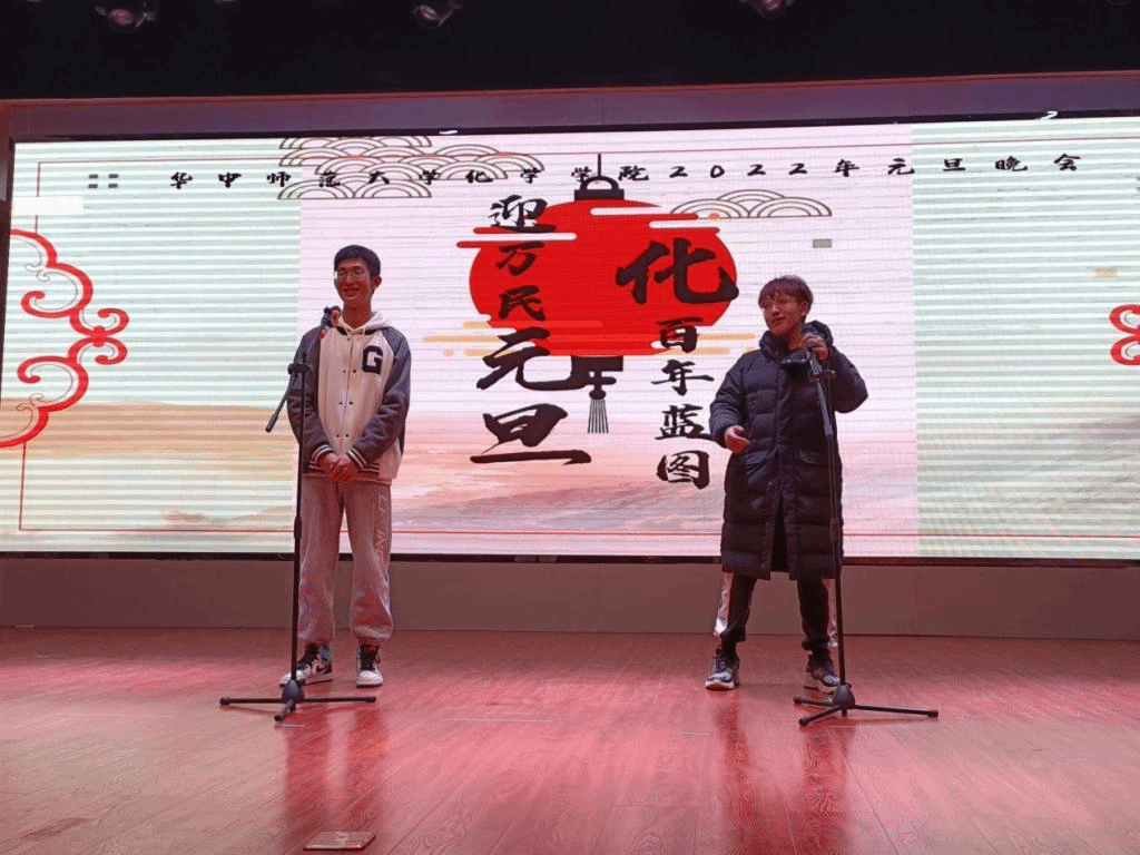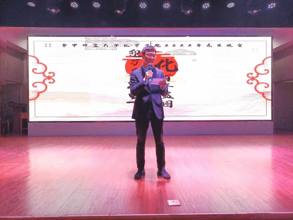 新闻中心消息 记者 许敏婧 李瑶 田有茂 王赢笛“岁岁常欢愉,万事皆胜意。”12月10日晚化学学院2021级“迎万民元旦,‘化’百年蓝图”元旦晚会在大学生活动中心五楼顺利举行。本次活动由共青团华中师范大学化学学院委员会主办,由华中师范大学化学学院学生会文艺部、化学学院2021级团总支承办。参加本次元旦晚会的嘉宾有化学学院党委副书记徐芬,副院长郭彦炳,团委书记马莹,团委副书记孙煜林,2019级辅导员武双欣,2020级辅导员聂敏,2021级辅导员安晓蕾,2021级各班班主任以及学生班主任。本次活动由邱宏道、王一戈、刘柯兰、郝佳郅、唐一鑫主持。