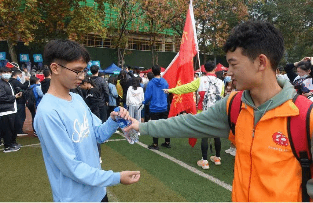 雨后,男子1500米比赛照常进行。地面很湿,但是跑旗志愿者们不顾风雨,奋力与运动员们一起奔跑,形成一道亮丽的风景线。院旗随风飘扬,击鼓声与呐喊声回响耳畔,点燃了化院人的斗志,展现了化院人的气场!比赛结束后,志愿者给运动员递水,并搀扶回大本营。
