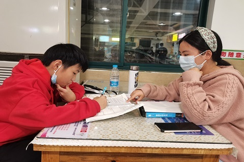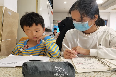 辅导过程中,志愿者马依发现小阳(化名)在学习过程中有些心不在焉,于是她停下辅导,耐心地开导小阳,并且通过玩数学小游戏的方式重新让小阳对学习产生兴趣,帮助小阳逐渐进入学习状态。在马依的辅导下,小阳进行了数学、英语等科目的学习,完成了周末作业并且解决了部分学习上的困惑。
