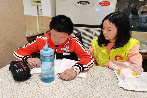 食堂辅导活动正在如火如荼地进行中。志愿者肖雪菲辅导龙龙(化名)完成数学作业并指导他进行了试卷错题的订正。在指导龙龙订正错误时,肖雪菲发现龙龙做题思路基本正确,大多数错题都是计算错误导致的。对此,她告诉龙龙做题不能只追求速度,还应该重视计算结果,这样才能提高正确率。与此同时,志愿者武雪婷正辅导小浩(化名)复习巩固拼音方面的知识。在辅导过程中,小浩十分的认真,会主动向武雪婷提出自己的问题,武雪婷也会及时指导他找到解决办法。武雪婷表示,在自己指出小浩的发音错误时,小浩能及时改正并不断练习,他的学习态度十分端正。